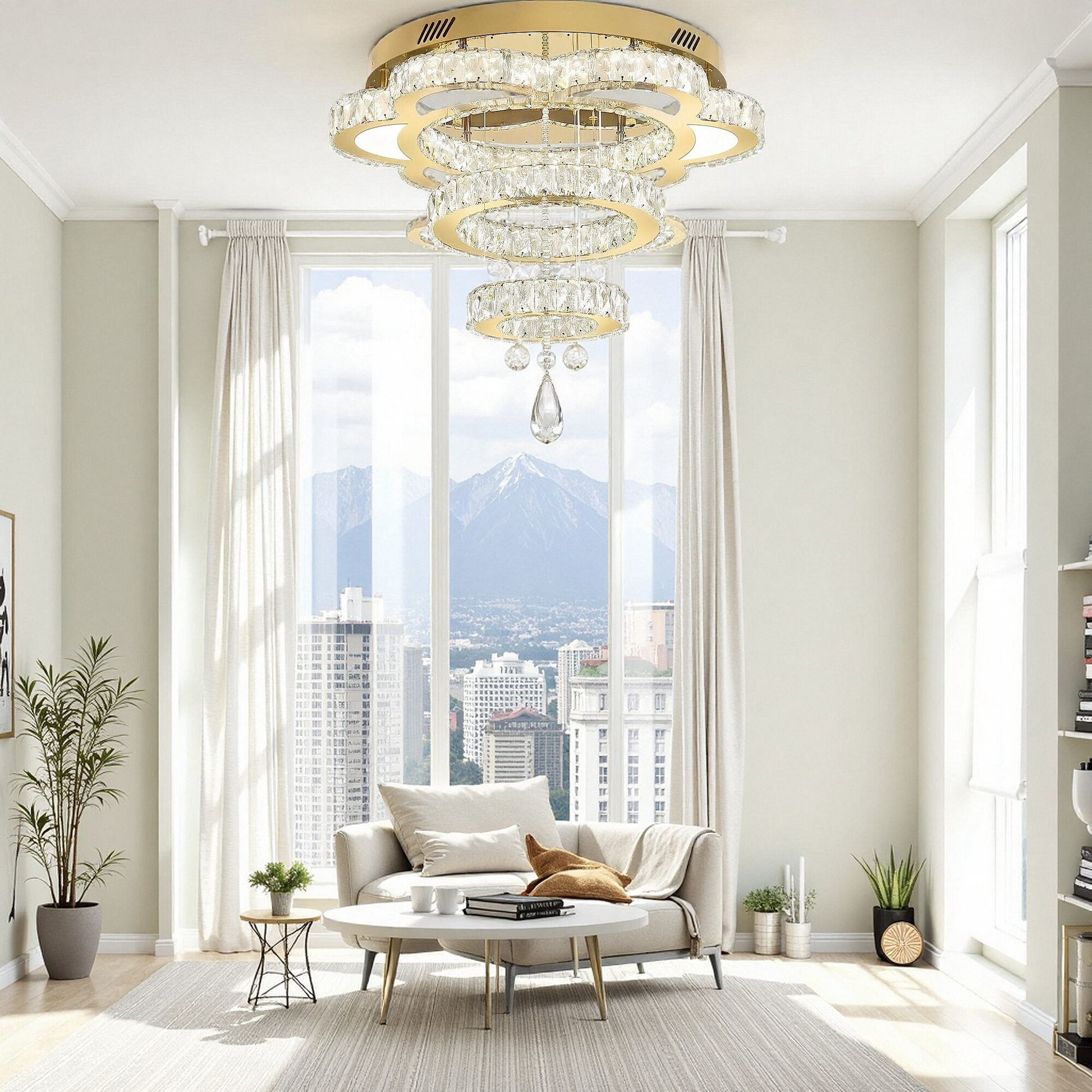 - 【Crystal Gold Chandelier Size】:L24" X W24" X H23". The voltage range is 85V-256V. For sloping ceilings, please inform us and we will provide a free ceiling fitting